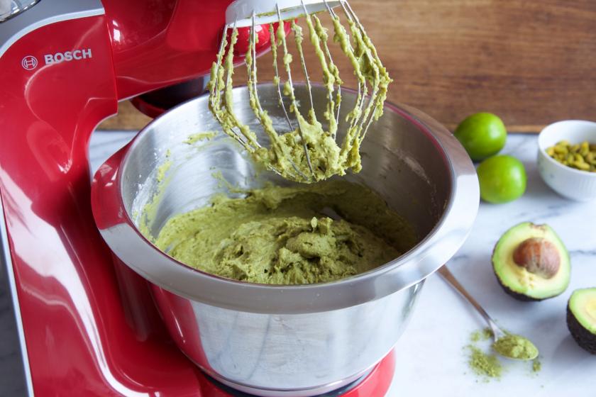 Nummer eins: Avocado - klar. Klingt erst mal speziell. Aber Gemüse im Kuchen mochte ich ja schon immer unheimlich gerne. Siehe mein Zucchinikuchen. Dazu ein bisschen Butter. Nicht ganz so viel wie in meinem Marmorkuchen. Ist ja auch ein Rührkuchen. Aber so ein bisschen Fett muss schon sein. Sorgt schließlich für die absolute Saftigkeit. Dann natürlich noch Eier. Vier an der Zahl. Und die üblichen Verdächtigen wie Zucker, Vanillezucker, Milch und Mehl. Salz für das gewisse Etwas. Zimt ginge übrigens auch. Fehlen noch Backpulver für die Luftigkeit und diese zwei Kandidaten: Avocado und Limette - absolute Lieblingskombi. Findet Susanne übrigens auch, weshalb sie ihren Limettenkuchen ebenfalls mit Avocado verfeinert hat. Dann auch noch gemahlene Mandeln. Mag ich auch richtig gerne und haben den positiven Nebeneffelt, dass sie den Kuchen ebenfalls wunderbar saftig werden lassen. Hinzu kommen gehackte Pistazien für ordentlich Crunch. Und dann auch noch eine Prise Matcha-Pulver. Hatte ich am Anfang auch meine Probleme mit. Ich bin nicht der größte Matcha-Fan. Aber wenn man einmal verstanden hat, wie es funktioniert, ist das eine ganz großartige Zutat. Wichtig ist, dass du dich langsam herantastest. Der Grad zwischen "zu viel" und perfekt ist nämlich ganz schmal. Alles miteinander verrühren und fertig ist dein neues Avocado-Glück.