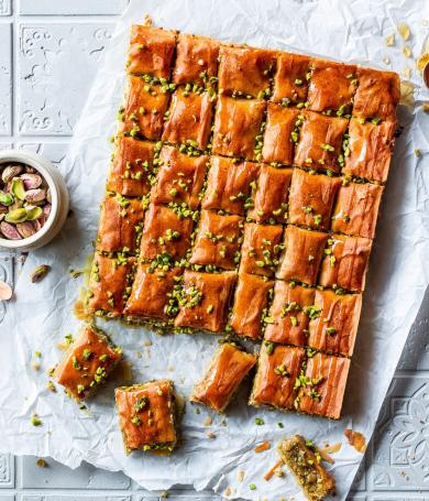 Es gibt ihn wirklich – den Baklava Cheesecake. Und er ist noch viel besser als ich ihn mir erträumt habe. Die unterste Schicht besteht aus einem dünnen, knusprigen Filoteig-Boden, der mit karamellisierten Nüssen bedeckt wird. Darauf kommt eine doppelte Füllung, so cremig wie keine zweite. Hier vereinen sich Frischkäse, griechischer Joghurt, Schmand und Sahne – Endstufe Cremigkeit.