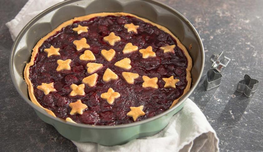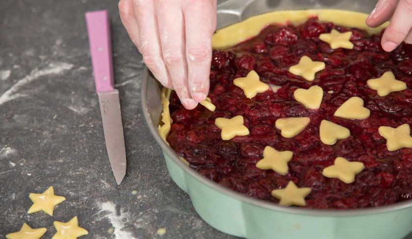 Das Herzstück des Cherry Pies ist natürlich die saftige Kirschfüllung. Wenn Saison ist, am besten aus frischen Früchten. An allen anderen Tagen in Jahr kannst du aber auch zu TK-Kirschen greifen. Die Füllung aber in jedem Fall mit diesen drei Gewürzen verfeinern: Zimt, Koriander und Kardamom. Dieses Trio macht die Füllung zu einer ganz besonderen. Gerade der Kardamom. Den kennst du vielleicht auch schon schwedischen Zimtschnecken. Die warme Note jenes Gewürzes passt einfach unheimlich gut zu den fruchtigen Kirschen. Fehlt eigentlich nur noch die „Teigdecke“, die den Cherry Pie perfekt macht. Klassischerweise ist diese häufig geflochten. Schöner finde ich aber eine Verzierung aus „Teigstücken“, die als Sterne, Blätter und Herzen ausgestochen werden.