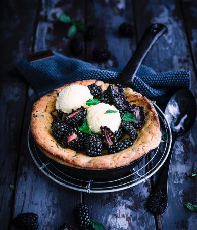 Pfannen-Cookie mit Amaretto-Eis und Brombeeren