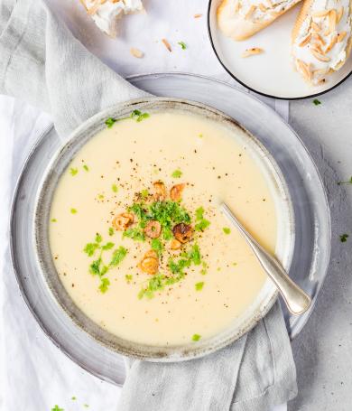 Mandeln abgießen und grob hacken. Knoblauch schälen und ebenfalls hacken. Beides mit Pastinaken und Leinsamen samt Flüssigkeit in einen Mixer geben und pürieren. Gewürze untermischen und mit Salz und Pfeffer abschmecken.