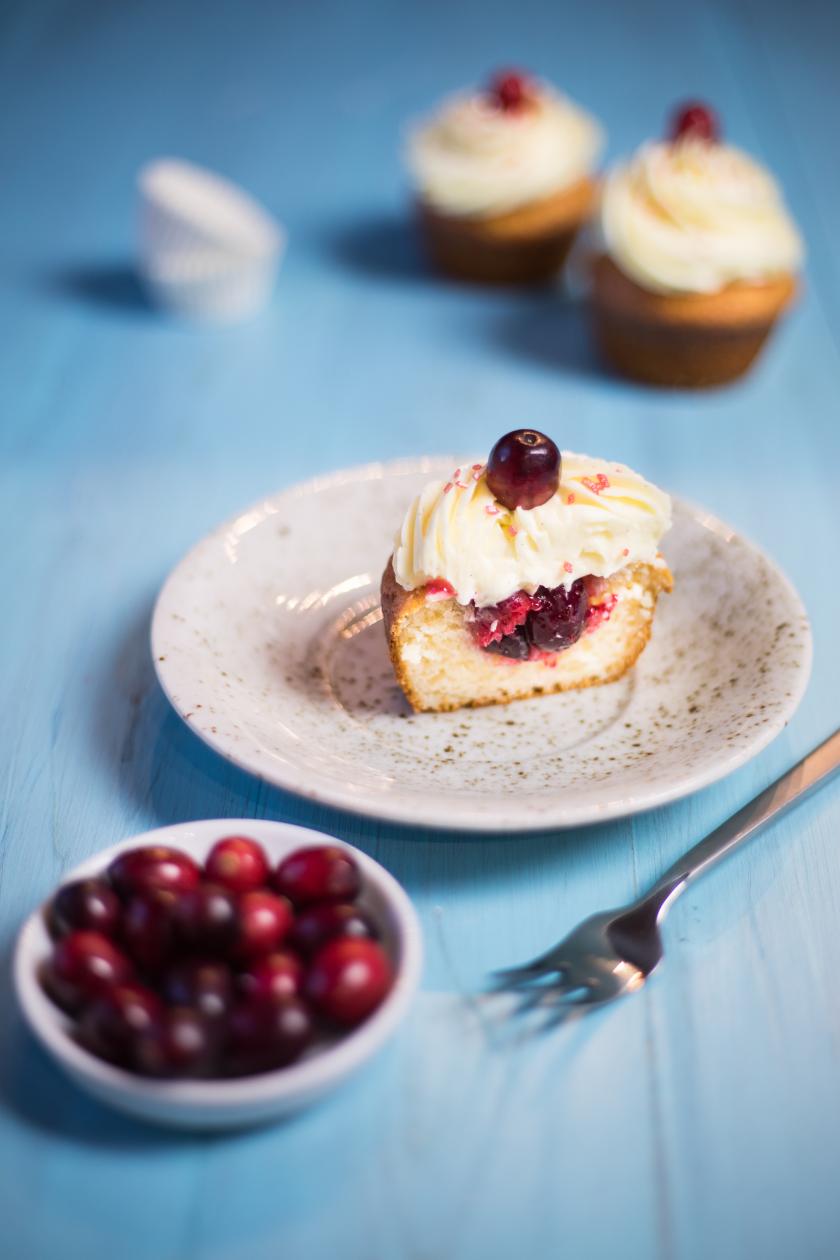 Die Muffins in der Form auskühlen lassen und dann vorsichtig herauslösen. Mit einem Messer ein kleines Loch in die Muffins schneiden. (Der übrige Teig kann zu Cakepops verarbeitet oder direkt genascht werden.) Jeweils etwa 1-2 TL Cranberrykompott in die Aushöhlung füllen.
