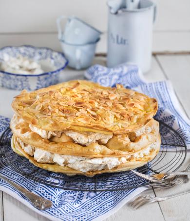Nach dem Backen wird der Boden waagerecht geteilt. Am einfachsten geht das mit einem Stück Nähgarn – mein Geheimtipp. Einfach den Boden rundherum 1-2 cm tief einschneiden, ein langes Stück Nähgarn in die Schnittstelle legen, Enden überkreuzen und nach außen ziehen. Auf dem unteren Boden wird anschließend die Füllung aus Sahne, Instant-Eiskaffeepulver und Vanillezucker verteilt – das Herzstück der Torte. Fehlt nur noch das Topping. Nein, der obere Kuchenboden kommt nicht einfach so auf die Eiskaffee-Torte. Sondern wird vorab zerbröselt und mit gehobelten Mandeln in der Pfanne geröstet. Für ein bisschen Crunch auf der Kaffeecreme.
