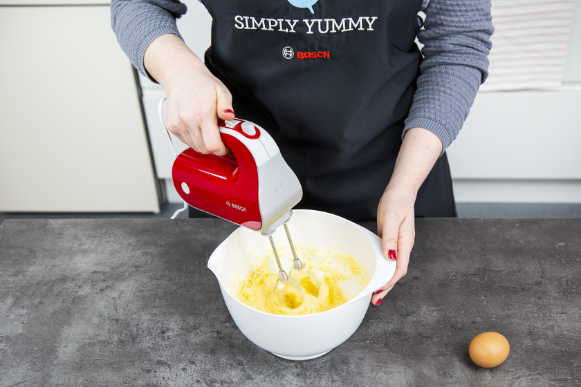 Unbedingt darauf achten, dass alle Zutaten Zimmertemperatur haben. Nur so lässt sich die Butter richtig schön schaumig schlagen. Und nur so entsteht zwischen Butter und Eier eine homogene Masse. Sind die Eier zu kalt, gibt’s Flocken.