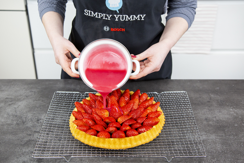 Einen Tipp, den ich von einer Kollegin bekommen habe: Tortenguss mit einem Pinsel auftragen. So kannst du genau dosieren, wie viel Tortenguss du auf deinen Erdbeeren haben möchtest.