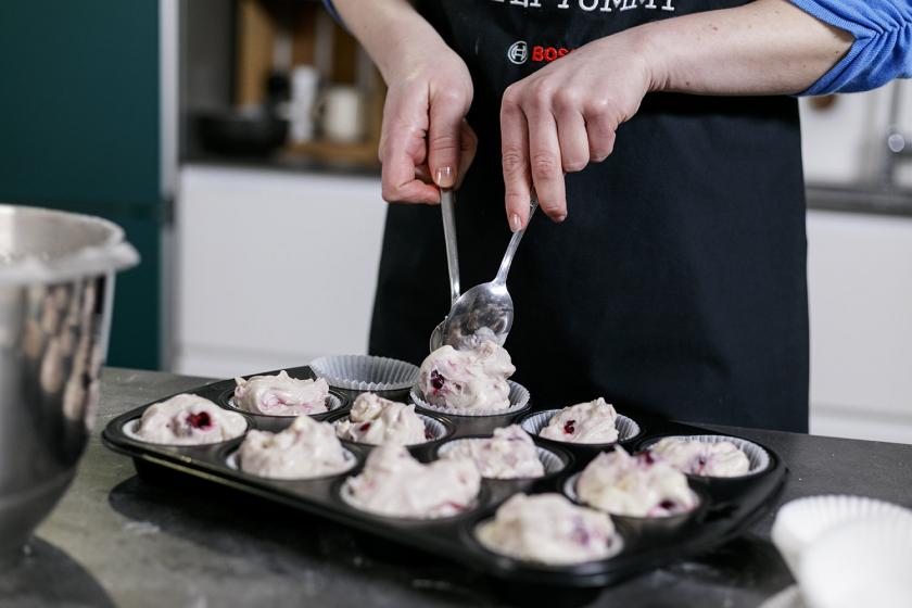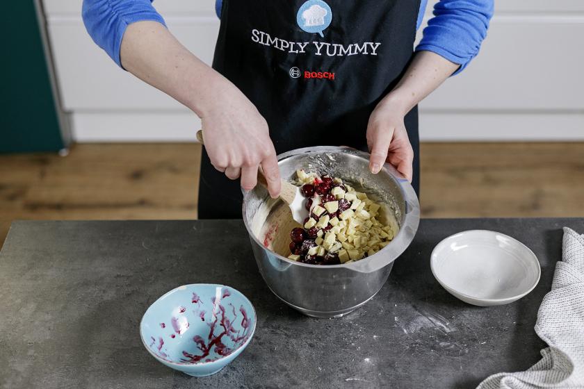 Habe ich dir schon verraten, dass jene Kirschmuffins ganz besondere Kirschmuffins sind? Die Minis kommen nämlich mit weißer Schokolade im Teig daher. Und natürlich der Kombination aus den bewährten drei Zutaten: Öl und Buttermilch in Kombination mit Natron. Damit gelingen deine Muffins immer – und ich meine wirklich immer – so richtig saftig-locker. Warum? Zum einen hat Öl einen höheren Fettgehalt als beispielsweise Butter. Das hält den Teig feucht. Deswegen bereite ich meine Miniküchlein am liebsten immer mit beiden Fettsorten zu – Butter für den Geschmack und Öl für eine extra Portion Saftigkeit. Wie gut jene beiden Zutaten zusammen funktionieren, hat Sina auch schon in ihrem Grundrezept für Muffins getestet und all ihre Ergebnisse für dich niedergeschrieben. Aus ihrem Guide weiß ich übrigens auch, dass Buttermilch in Kombination mit Natron und einem kleinen Teil Backpulver meine Kirschmuffins wunderbar fluffig-locker aufgehen lässt. Kleiner Tipp an dieser Stelle: Zügig arbeiten. Denn sobald trockene und flüssige Zutaten in Berührung kommen, beginnen die Triebmittel mit ihrer Arbeit.