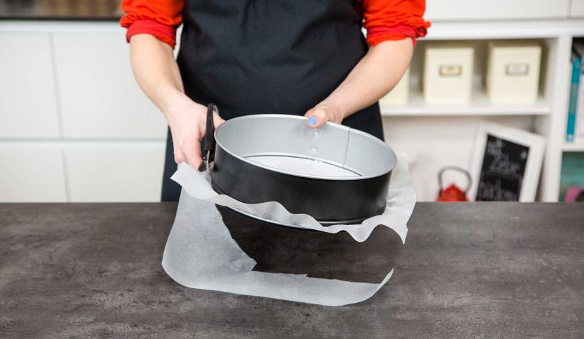 Heize den Backofen auf 180 °C Ober-/Unterhitze vor. Lege den Boden einer Springform mit Backpapier aus.