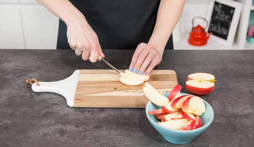 Wasche die Äpfel, schneide das Kerngehäuse heraus und schneide die Äpfel in Spalten.