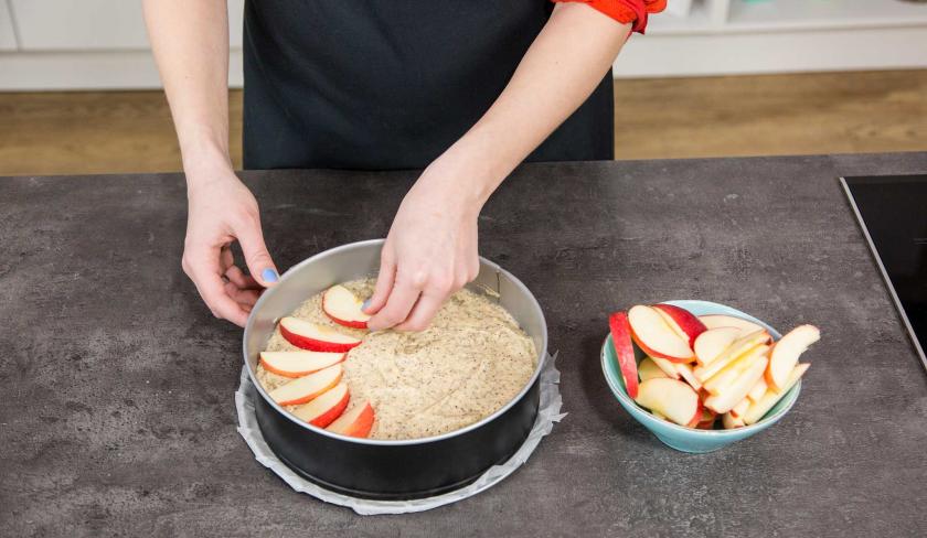Fülle den Teig in die Springform. Belege den Teig mit den Apfelspalten.