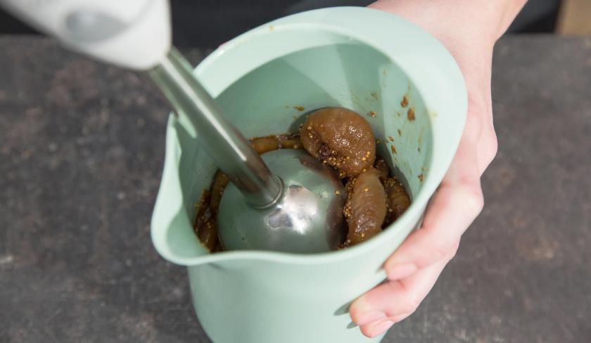 Gib die Feigen mit 480 ml Wasser in einen Topf und koche sie so lange, bis sie weich sind. Nun gibst du den Amaretto und das Vanilleextrakt dazu und pürierst alles schön fein.