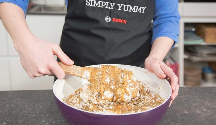 Nun kannst du das Mehl mit Backpulver, den Gewürzen und den Walnüssen mischen und unter die Masse heben.