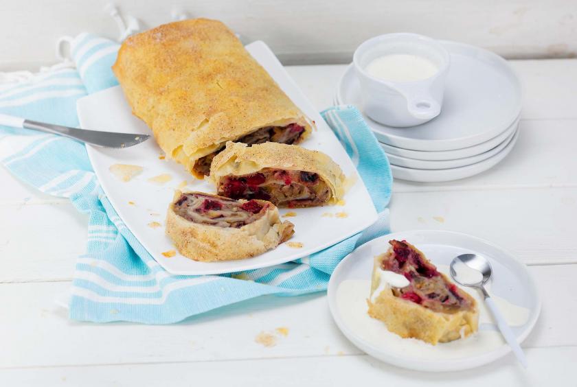 Geschmacklich ist der Unterschied zwischen selbst gemachtem Strudelteig und Fertig-Filoteig nicht wirklich bemerkbar. Letzteren verwende ich auch immer für meine gebackenen Bananen das schmeckt super. Strudelteig an sich ist ja eine sehr neutrale Angelegenheit und die Füllung der eigentliche Star. Und die braucht sich bei diesem Rezept nicht zu verstecken. Cranberries, Walnüsse, Zimt und Orangenlikör gesellen sich zu fruchtigen Pflaumen. Dazu noch eine selbst gekochte Vanillesoße. Was will man mehr?