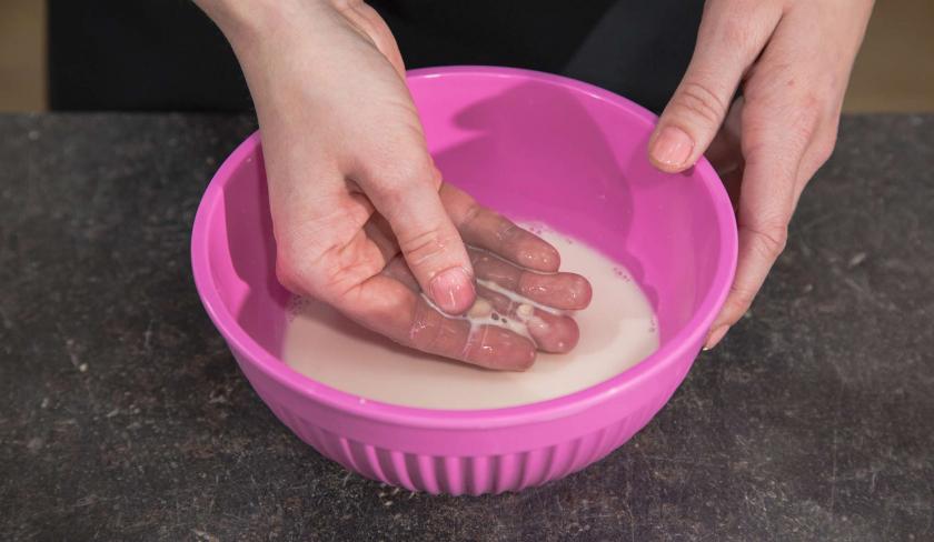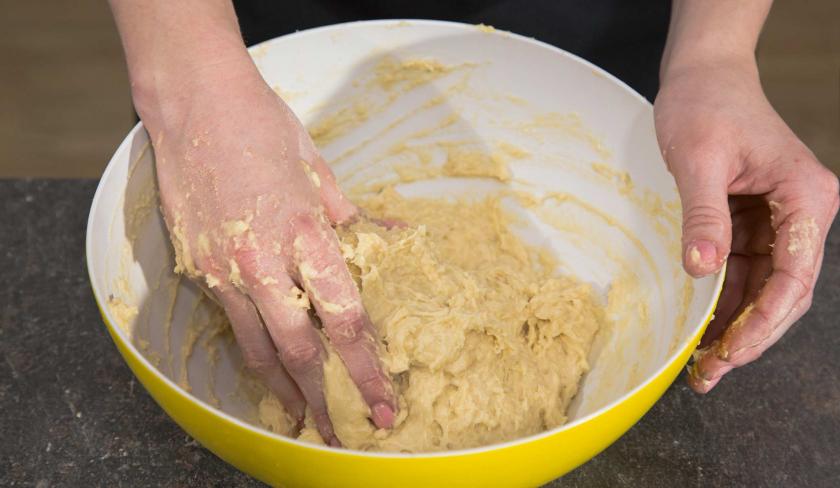 Löse die Hefe in der lauwarmen Milch auf. Am besten geht das, wenn du die Hefe dafür in kleine Brösel teilst und diese mit der Hand in der Milch auflöst. Mische Mehl mit Zucker und Salz und gieße die Hefemischung langsam dazu.