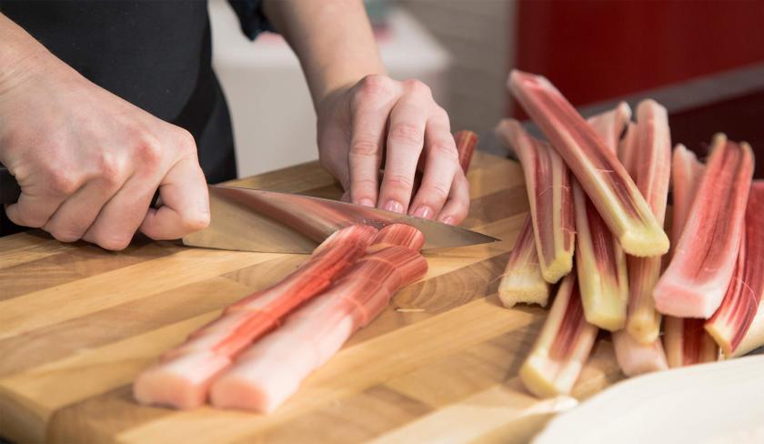 Wasche den Rhabarber, putze und entfädle ihn. Schneide die Stangen anschließend schräg in ca. 2 cm lange Stücke.