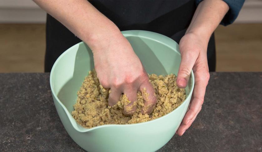 Mische für die Streusel alle angegebenen Zutaten miteinander und verarbeite sie zu einer krümeligen Masse. Stelle diese bis zur Verwendung schön kühl.