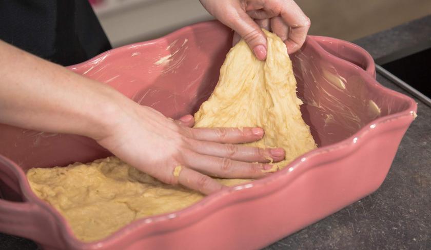 Fette eine Form (ca. 30 x 40 cm) ein. Gib nun den Teig hinein und ziehe ihn mit den Händen sorgfältig in die Ecken. Er sollte in der gesamten Form gleichmäßig verteilt sein.