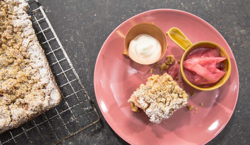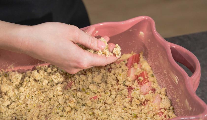 Das ofenwarme Obst unter der knusprigen Decke schmeckt auch richtig gut mit einer Kugel Eis und eignet sich daher perfekt als unkompliziertes Dessert. Oder du verwandelst die letzten Stangen noch zum Rhabarberkuchen mit Schmand - der ist herzerwärmend gut!