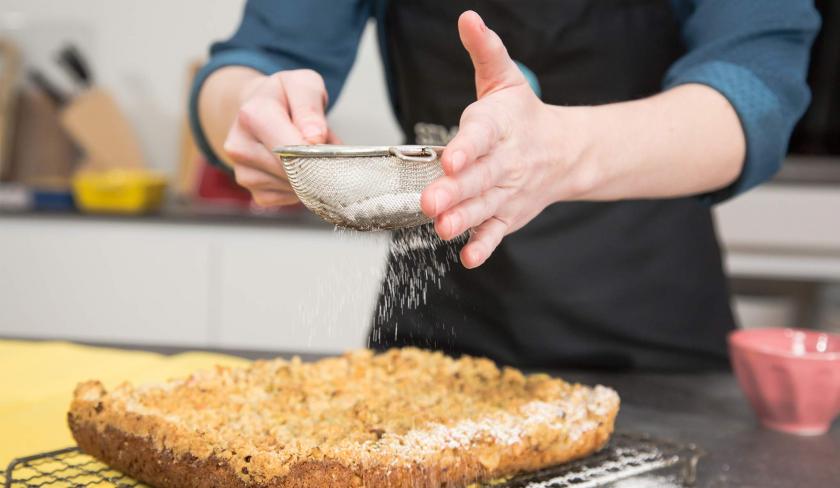 Nimm den Crumble anschließend heraus, lasse ihn abkühlen und bestäube den Rand mit etwas Puderzucker.