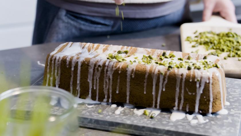 Zum Schluss den Kuchen dann nur noch mit Zuckerguss und gehackten Pistazien verfeinern. Oder Kokos in Form von Raspeln oder Chips. Oder gefriergetrockneten Himbeeren oder …