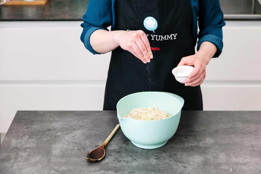 Die besten Müsliriegel werden aus Haferflocken gemacht. In meinem Fall greife ich immer zu glutenfreien Haferflocken, die ich auch zum Frühstück esse. Ich vertrage Gluten ja nicht ganz so gut. Noch ein Grund, warum du deine Müsliriegel ab sofort selber machen solltest. Dann weißt du nämlich ganz genau, was drin ist. Wenn du nicht die glutenfreie Sorte nimmst, einfach zu den klassischen zarten oder kernigen Haferflocken greifen, wie du sie beispielsweise für Porridge oder Overnight Oats verwendest. Dazu gebe ich immer noch ein paar zerbröselte Reiswaffeln – für ein bisschen Knusper. Das habe ich mir beim amerikanischen Pendant „Granola Bars“ abgeschaut. Allerdings kommen dort Rice Krispies zum Einsatz. Die sind nicht nur schwer zu bekommen, sondern auch voll mit Zucker. Und dann auch noch eine Prise Salz.