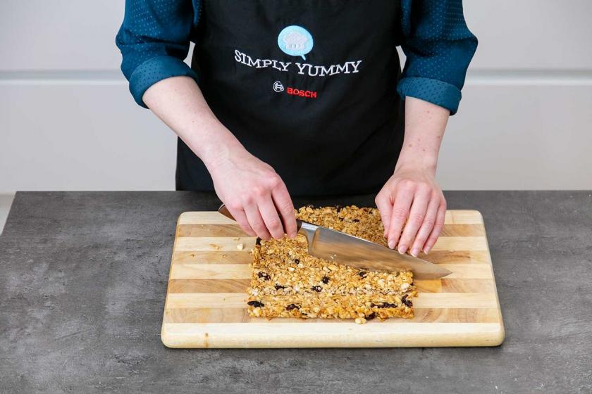 - Du hast keine Müsliform zur Hand? Eine eckige Backform tut es auch. Dann musst du deine Riegel nach dem Backen aber noch in Form bringen. Das geht am besten mit einem scharfen Messer. Dafür die Müsliplatte ein mal halbieren und die halben Platten jeweils in 5 Riegel schneiden. Am besten geht das, wenn die Riegel noch (lau-)warm sind.