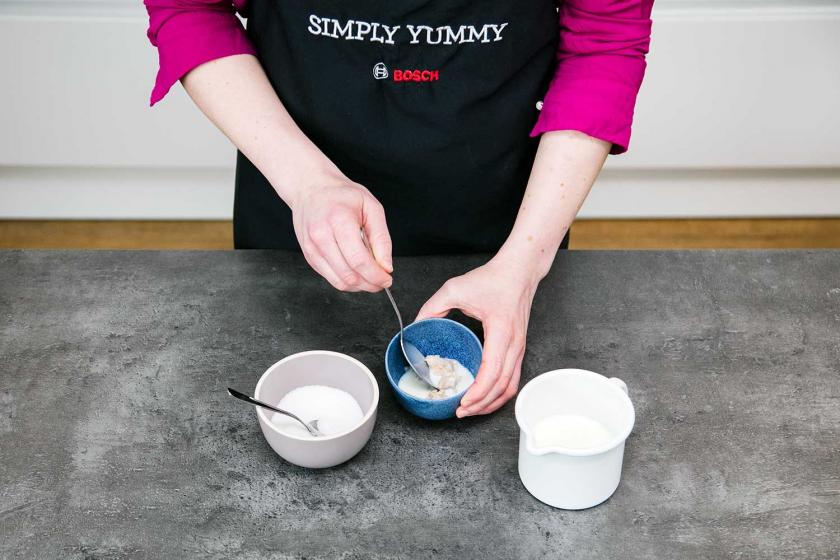 - 150 g Quark mit 50 g Zucker, 6 EL Öl, 6 EL Milch und 1 Prise Salz glattrühren.