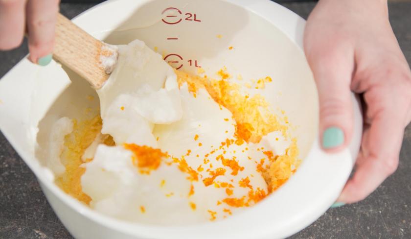 Schlage die Butter mit Eigelb, 80 g Zucker und Vanillezucker cremig und hebe dann den Joghurt, den Orangenschalenabrieb und den Eischnee unter. Mische Mehl mit Backpulver und ziehe die Mischung unter die Masse.