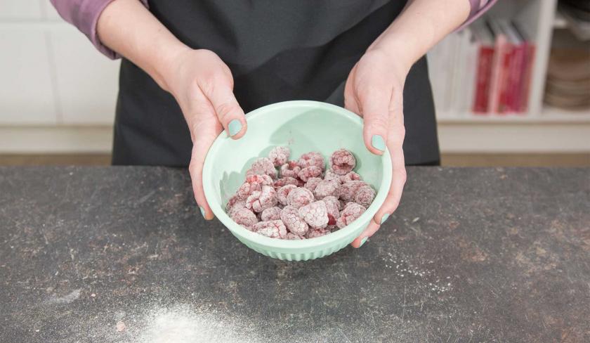 Wende die Himbeeren in etwas Mehl und schüttle überflüssiges Mehl ab.