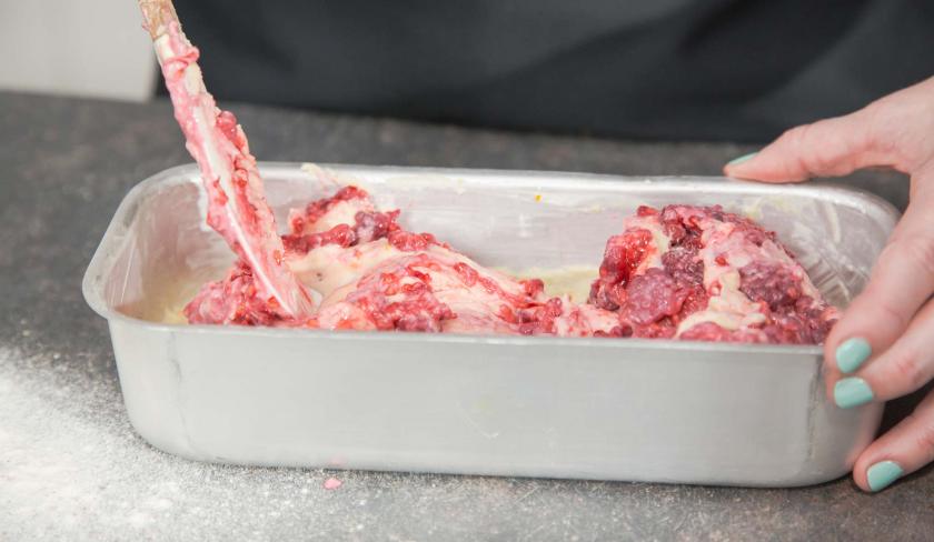 Halbiere den Teig und mische die Himbeeren unter die eine Hälfte des Teigs. Halbiere den Teil ohne die Beeren noch einmal und streiche die eine Hälfte davon in die Form. Gib dann den Teig mit den Himbeeren darauf. Abschließend legst du den verbleibenden Teig ohne Früchte oben auf.
