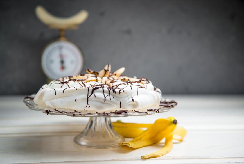Pavlova mit Kokoscreme, Banane und Schokosoße