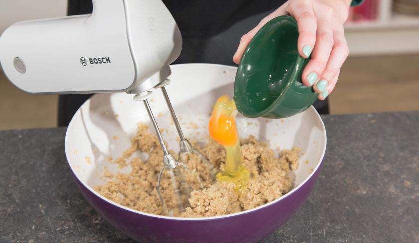 Gib nun die Butter und die beiden Zuckerarten in eine große Schüssel und schlage sie cremig. Gib das Ei dazu und vermische alles gut miteinander. Nun kommen Milch, Vanille, Mehl, Backpulver und Kakaopulver dazu. Mische alles so lange miteinander, bis ein glatter Teig entsteht.