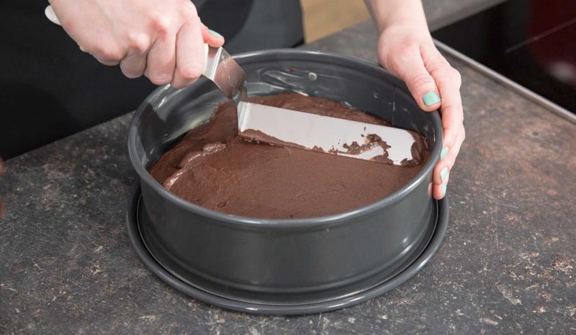 Gib den Teig in die gefettete Springform . Der Kuchen wird nun etwa eine Stunde lang gebacken, bis sich der Teig fest anfühlt. Lasse den Kuchen auf einem Kuchengitter abkühlen.