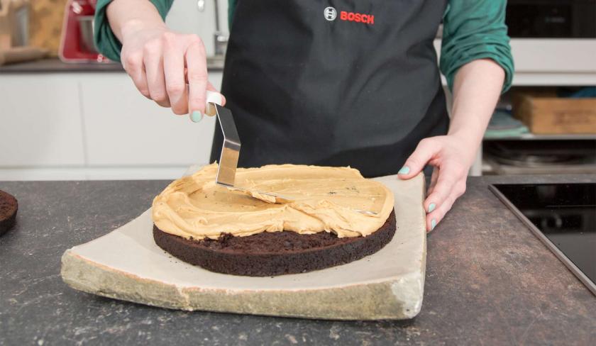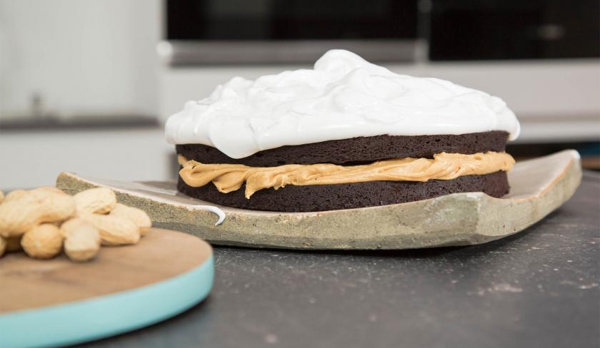 Verschlage Butter, Erdnussbutter, Zucker und Salz in einer großen Schüssel miteinander. Halbiere den Kuchen und verteile die Creme auf der unteren Hälfte. Danach setzt du die obere Hälfte wieder darauf.