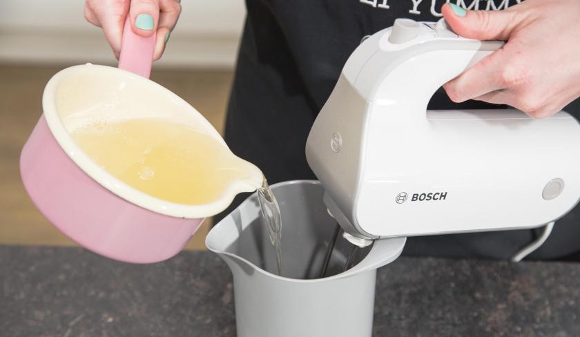 Lasse die Gelatine jetzt 10 Minuten lang in 120 ml kaltem Wasser einweichen. In der Zwischenzeit gibst du Zucker, Sirup und 60 ml Wasser in einen Topf und bringst das Ganze bei mittlerer Hitze zum Kochen. Lasse es etwa eine Minute köcheln. Nimm den Topf vom Herd und gieße den kochenden Sirup in die Gelatinemischung. Rühre dabei die ganze Zeit mit dem Handrührgerät auf höchster Stufe. Gib das Salz dazu und rühre die Masse weitere 12 Minuten in deiner Küchenmaschine. Gib nun das Vanilleextrakt dazu und vermische alles nochmals gut miteinander.