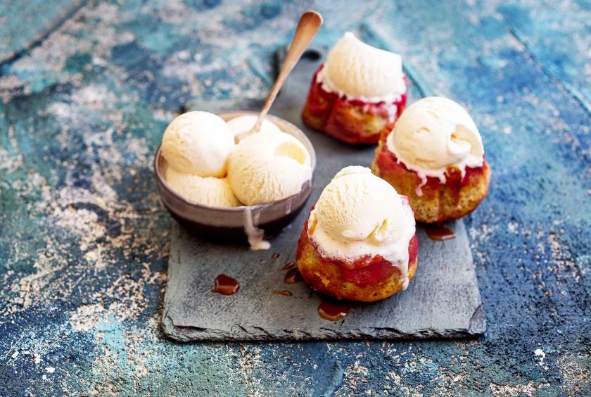 Nimm die Muffins aus dem Ofen nehmen und stürze sie sofort auf eine Platte (Achtung, es kann etwas heißer Karamell fließen). Serviere die Muffins warm oder kalt mit einer Kugel Eis.