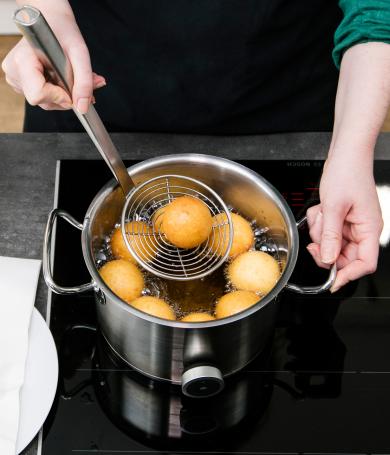 Im ersten Schritt musst du den Teig anrühren. Der ist ein bisschen anders als beim klassischen Rezept. In die Variante aus dem Backofen kommt nicht nur mehr Quark, sondern kommen auch mehr Eier. Der Teig ist also insgesamt weicher. Das brauchen die Bällchen auch. Schließlich wird das Innere hier nicht von 0 auf 100 erhitzt, sondern klassisch im Backofen gebacken. Was beiden Teigen gleich ist, ist die schnelle Zubereitung. Einfach alle Zutaten miteinander verrühren. Fertig. Wer möchte, der kann auch mal Apfelstücke unterheben. So wie ich es bei klassischen Apfelballen liebe.