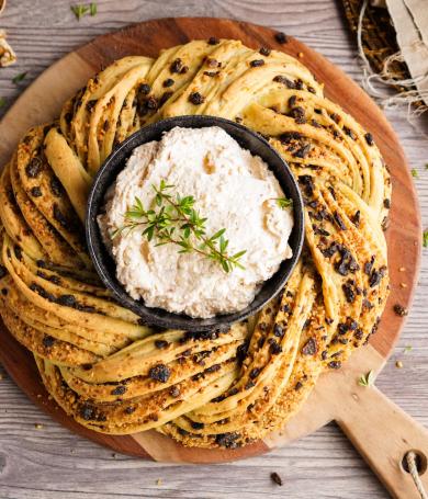 Hefezopf mit Walnüssen, Feigen und pikantem Dip