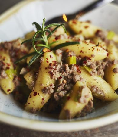 Schupfnudelpfanne mit Hackfleisch und Lauch
