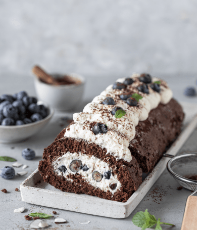 Das ist die beste Schoko-Biskuitrolle von allen. Denn der fluffige Schokoladenbiskuit passt hervorragend zu frischen Erdbeeren und Sahne in der Füllung. Damit hat sich die Schoko-Rolle einen Platz in unserer Sammlung der besten Erdbeerkuchen-Rezepte verdient.