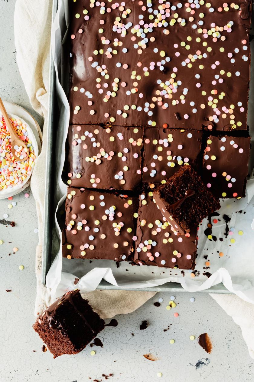 Schoko Blechkuchen mit Glasur und Zuckerstreuseln