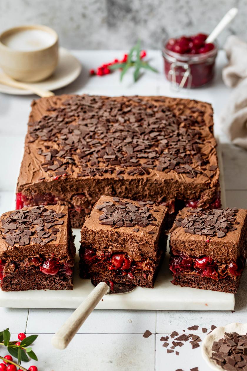 Schokoschnitten mit Creme vom Blech – etwas Besseres kann ich mir gar nicht vorstellen. Hier bekommst du nämlich die dreifache Schokodröhnung dank Schokobiskuitboden, Schokosahne und Schokoraspeln. Aber nicht genug. Zwischen Sahne und Boden tummeln sich auch noch Kirschen.