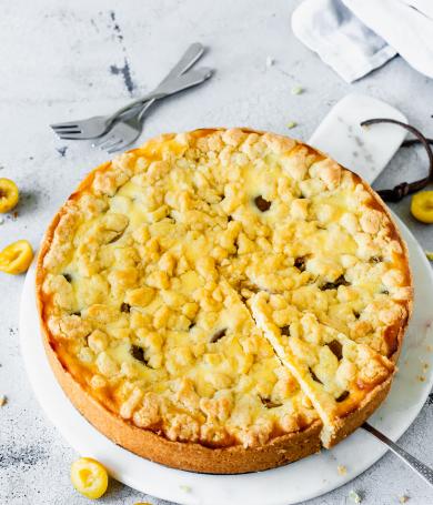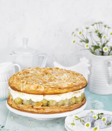 Stachelbeerkuchen mit Pudding und Mandeln als Streusel