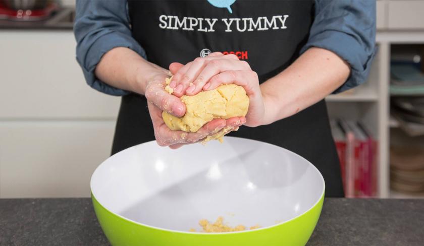 Mische Mehl mit Backpulver, Zucker, Butterwürfeln und Eigelb und verknete alles zügig zu einem glatten Teig. Wickle den Teig in Frischhaltefolie, drücke ihn etwas flach und lege ihn für 1 Stunde in den Kühlschrank.