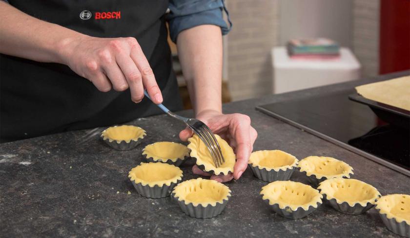 Besonderes Zubehör: Rührschüssel, Handrührgerät, Nudelholz, Backpapier, Topf, 22 Tartelettesförmchen (Ø 5 cm)