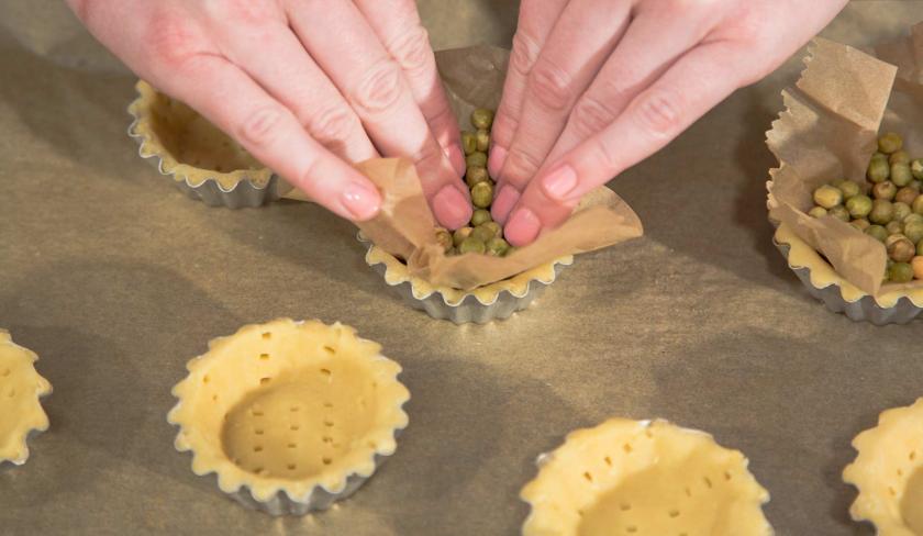 Lege ein Blatt Backpapier auf den Teig und beschwere es mit getrockneten Hülsenfrüchten. Backe alles nun 10 Minuten im Ofen.