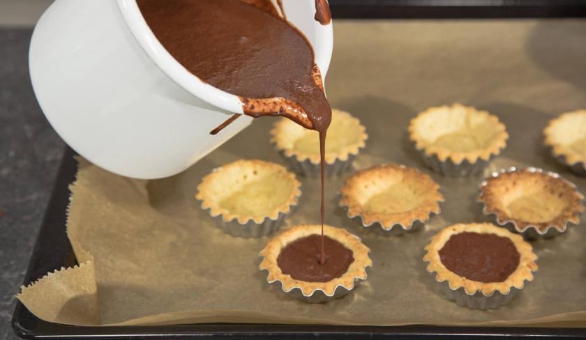 Fülle die Schokoladenmasse in die Förmchen. Gib die Tartelettes für weitere 15 Minuten in den Ofen.