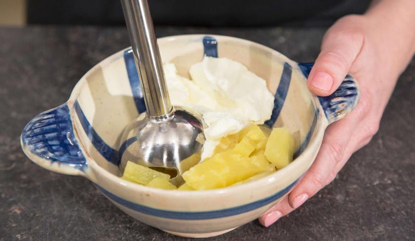 Teile die Ananas in grobe Stücke und püriere sie mit 85 g Frischkäse zu einer feinen Masse. Mische Mehl mit Backpulver, Kakaopulver und Salz.
