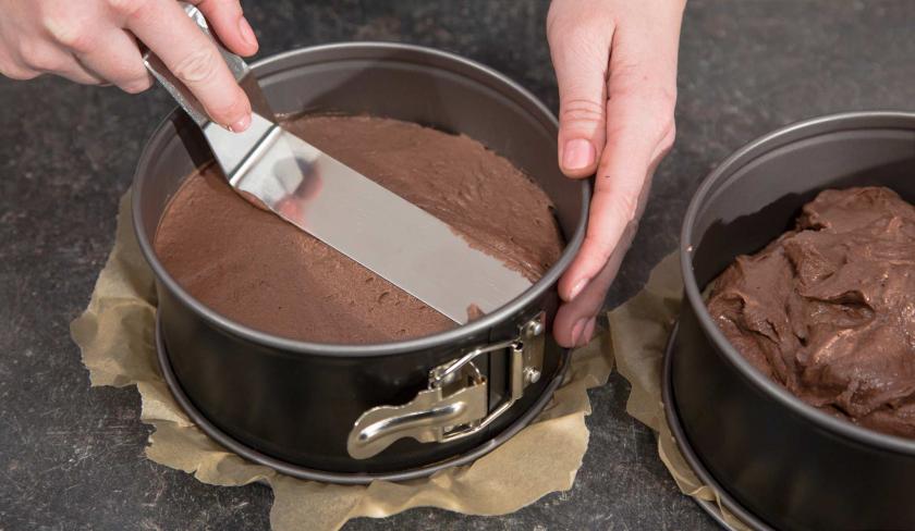 Fülle den Teig in die beiden Springformen und backe die Böden ca. 40 Minuten. Decke die Oberfläche mit Alufolie ab, sollte sie drohen, zu dunkel zu werden. Führe die Stäbchenprobe durch. Nimm die Böden aus dem Ofen und lasse sie in der Form auskühlen.