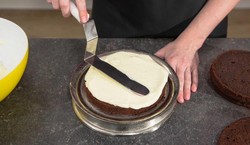 Löse beide Kuchenböden aus der Form und halbiere sie jeweils waagerecht. Setze einen Kuchenboden auf eine schöne Tortenplatte. Verstreiche ⅓ der Frischkäsefüllung darauf. Verfahre mit den restlichen Böden und der restlichen Füllung genauso. Stelle die Torte kalt.
