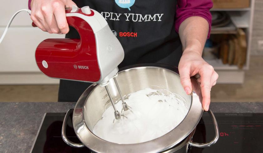 Schlage für das Frosting das Eiweiß mit Salz über dem heißen Wasserbad mit den Quirlen des Handrührgeräts leicht schaumig. Füge dann 100 g Puderzucker und das Backpulver zu und schlage so lange weiter, bis die Masse fluffig ist und glänzt. Nimm die Masse vom Wasserbad und rühre 1 EL Malibu unter.